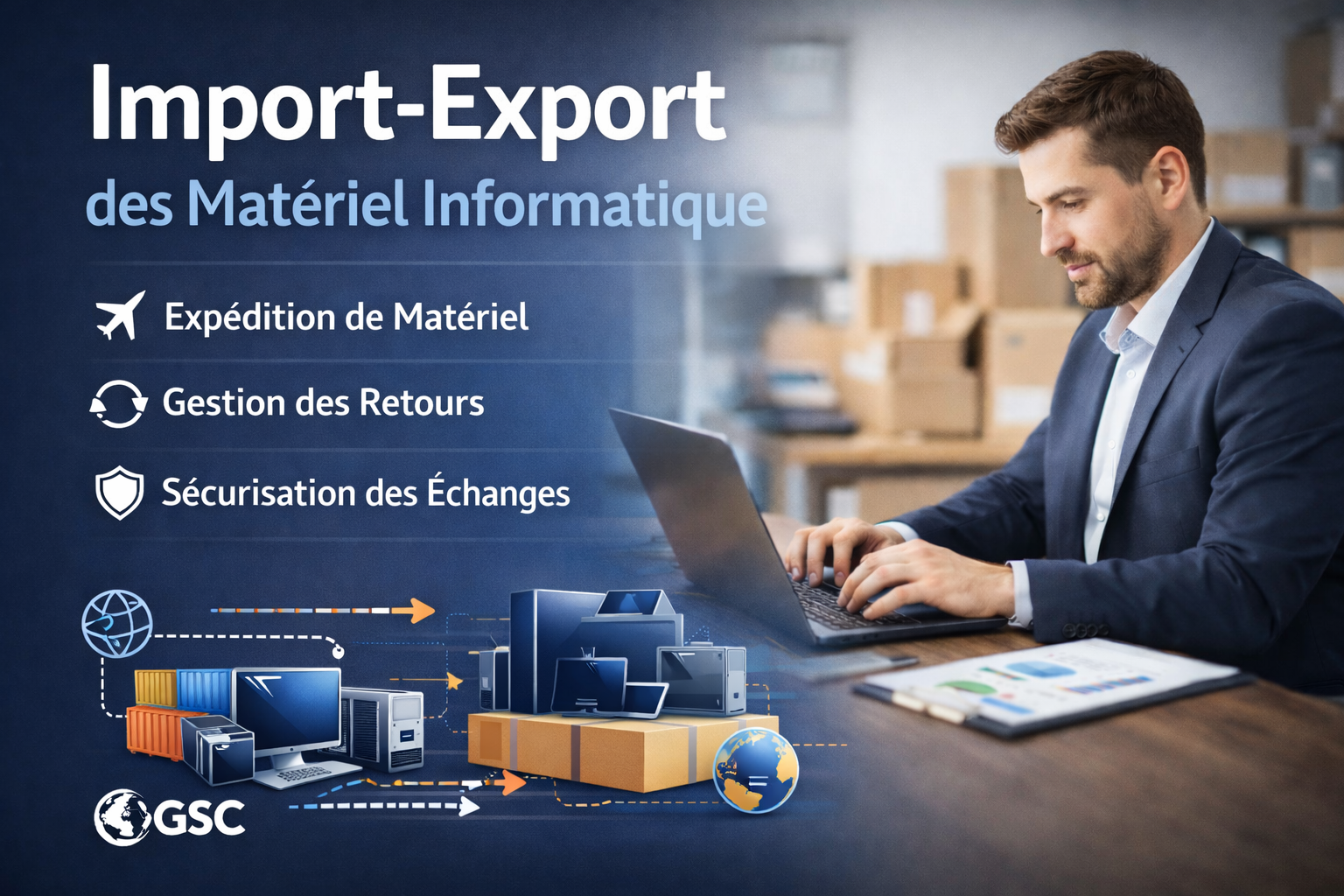 GSC Innov Tech maîtrise l’ensemble de la chaîne logistique internationale pour le matériel informatique. De l’achat auprès de fournisseurs certifiés jusqu’à la livraison à votre porte, nous gérons chaque étape avec rigueur et transparence.